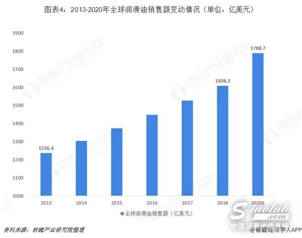 根据弗若斯特沙利文以及中国润滑油网统计数据显示,随着全球润滑油消耗量逐渐增长,全球润滑油行业销售收入也同样呈上升趋势,润滑油价格基本随原油价格同比波动,波动时间滞后原油价格2-3个月。2018年,全球润滑油销售金额约为1608.3亿美元,年均复合增长率超过5%,预计2020年,全球润滑油销售额将会达到1788.7亿美元。
