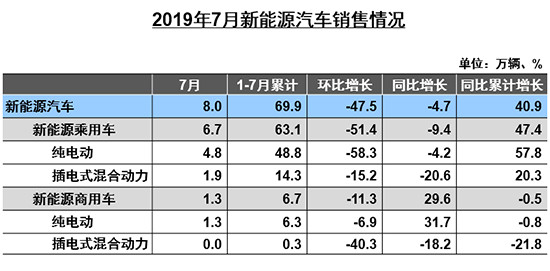 7月,新能源汽车产销表现明显不如上月,产销量环比和同比均呈下降。当月产销完成8.4万辆和8.0万辆,环比下降37.2%和47.5%,同比下降6.9%和4.7%。在新能源汽车主要品种中,纯电动汽车和插电式混合动力汽车产销环比均呈下降,其中纯电动汽车降幅更为明显。陈士华表示,由于6月新能源车补贴到期,7月新能源车尤其乘用车销量大幅下滑,同比销量也低于去年同期,这在往年是不常见的。