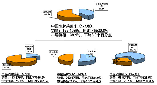 分国别来看,7月自主品牌销量为55.3万辆,同比下降13.3%,市场份额36.2%,比上年同期下降3.9个百分点;1-7月,自主品牌乘用车共销售455.1万辆,同比下降20.8%,市场份额39.1%,比上年同期下降3.9个百分点;1-7月,自主品牌轿车、SUV和MPV市场占有率分别为19.9%、52.7%和75.1%,较去年同期水平分别下降0.9个百分点、7.3个百分点和2个百分点。