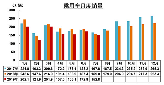 7月,乘用车销量明显低于上月,但同比降幅有所收窄。当月共销售152.8万辆,环比下降11.6%,同比下降3.9%,降幅比上月收窄3.9个百分点。