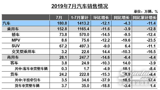 具体来看,7月汽车产销量分别完成180万辆和180.8万辆,环比下降5%和12.1%,同比下降11.9%和4.3%,同比降幅比6月分别缩小5.4和5.3个百分点。对此,中汽协秘书长助理陈士华分析称,7月产销虽然同比下降,但降幅相比6月有所收窄,去年同期产销处于低值是一个重要原因,并不能说明整体市场有所好转。