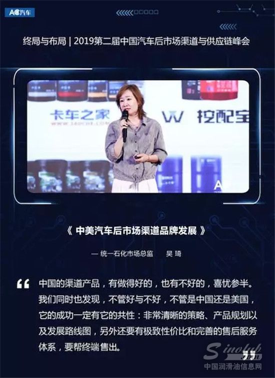 在峰会现场,统一石化市场总监吴琦女士围绕“中美汽车后市场渠道品牌发展”进行了精彩的演讲。为大家解答了很多关于汽车后市场渠道品牌如何发展的疑惑的同时,也分享了很多统一的经验。