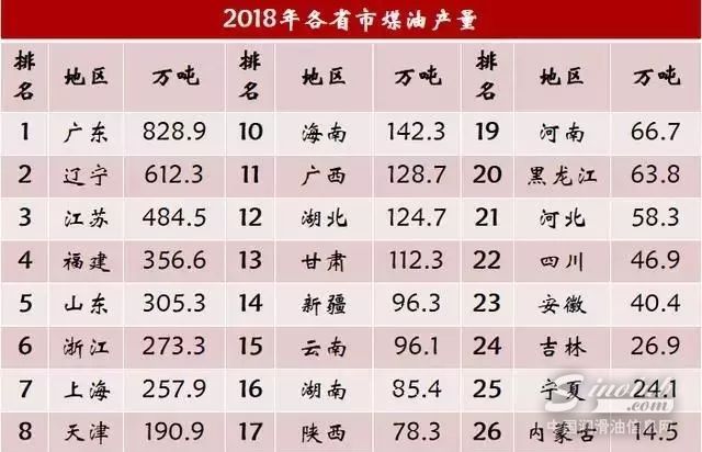 煤油的应用范围不如汽油和柴油,产量也相应低很多。全国范围内,广东的煤油产量最高,其次是辽宁和江苏,山东仅位于第五位。