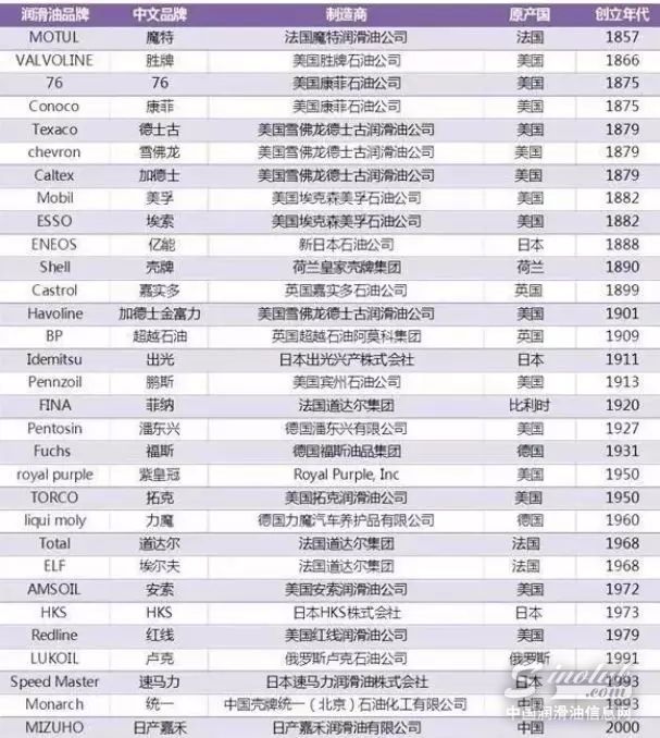 表:世界主要发动机润滑油制造商及品牌名录(排名不分先后)