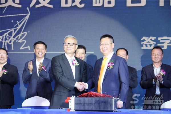 龙蟠科技董事长石俊峰(右一)与明天氢能公司董事长王朝云(左一)签订战略投资及战略合作协议