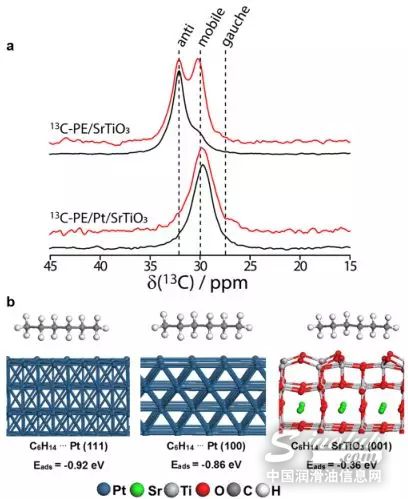 图3 聚乙烯氢解制备优质液体产品固体核磁共振13C富集PE吸附研究和密度泛函理论计算表明,PE在Pt上的吸附比在SrTiO3载体上的吸附更为有利。较小的Pt NPs与较高浓度的未配位Pt位点,将PE过氢水解成不需要的轻烃。
