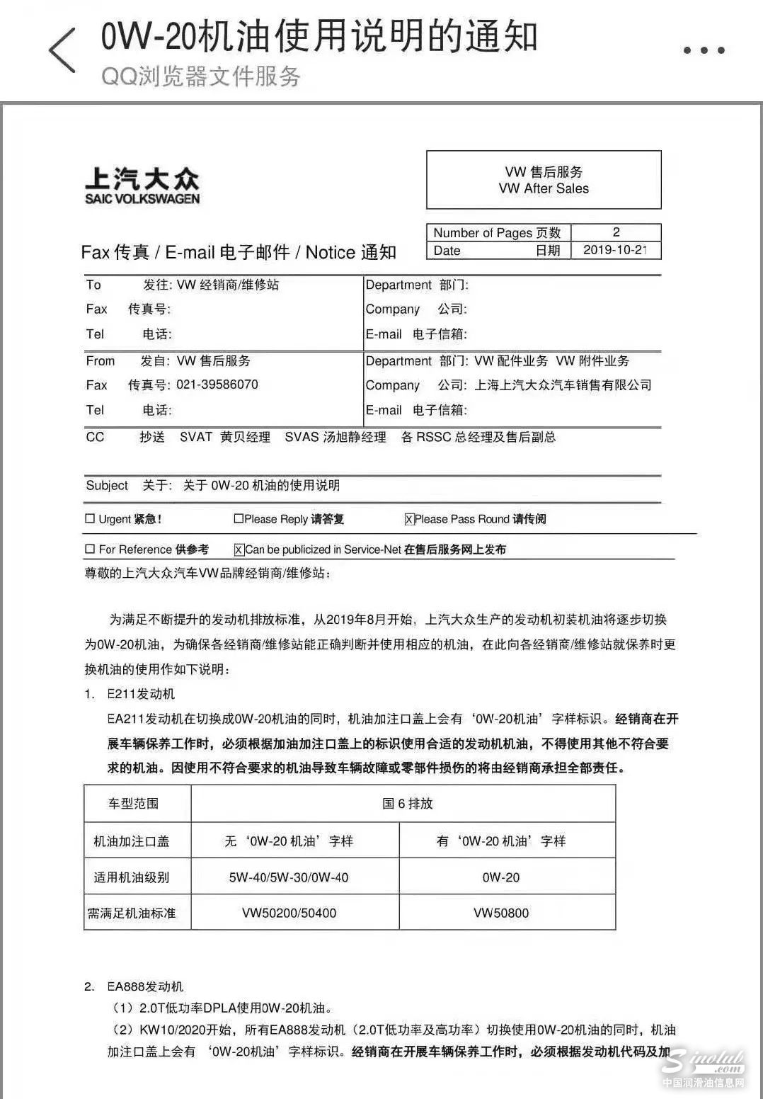 近日,上海大众官方在售后发文,通知经销商/维修站有关0W20机油的使用说明,如下图所示。