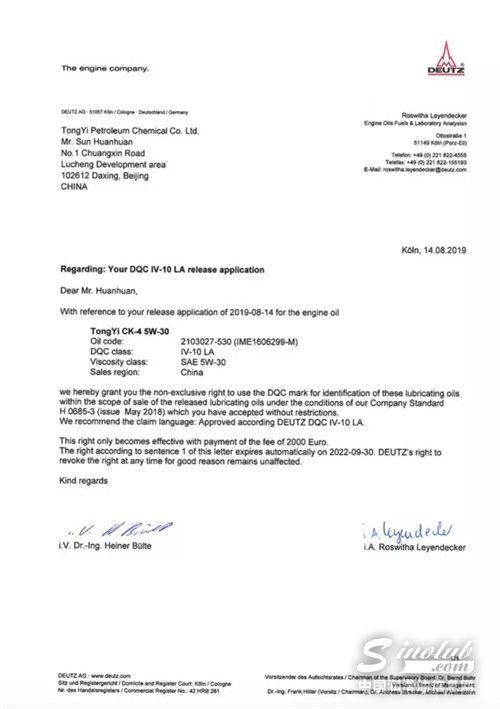 统一柴机油CK-4 5W-30获得德国道依茨认证