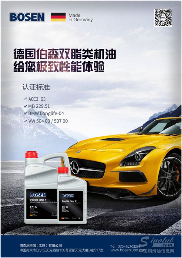◆Bosen X Double Ester 双脂类性能机油通过纳米技术减少沉积物、污泥和废气排放,降低噪音的同时具备增加油压和压缩压力,具有优异的抗磨损、清洁和低温冷启动性能,减少约40%的发动机磨损,满足ACEA C3、MB 229.51、BMW Longlife-04、VW 504 00 / 507 00规范认证。