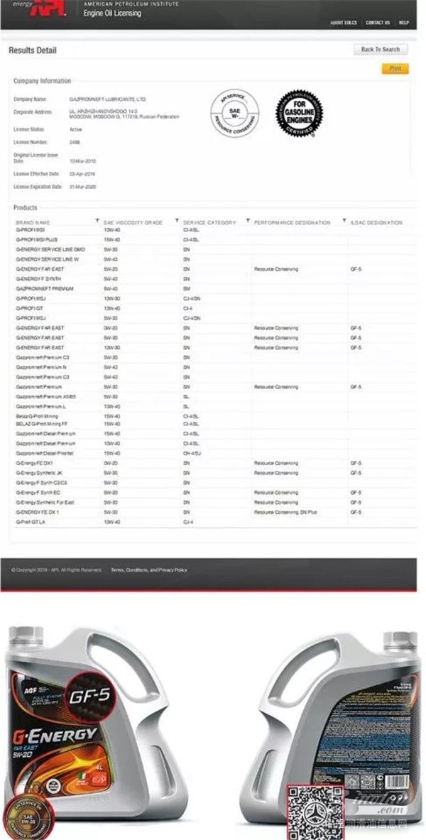 G-Energy吉安驰润滑油是意大利原装进口油品,2009年俄罗斯天然气工业石油-润滑油公司收购了世界四大添加剂品牌之一的雪佛龙在意大利的工厂,专门投入生产的高端润滑油品牌。油品通过了美国石油协会API认证(认证号2498),拥有超过400家设备制造商的OEM认证,包含宝马、奔驰、保时捷、大众、沃尔沃、雷诺、通用、康明斯、曼、采艾孚、卡玛兹、博世力士乐等等。同时,吉安驰润滑油是奔驰官方认证品牌,奔驰官网可以查询。