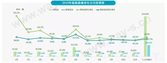 数据显示,11月新能源市场销量环比有小幅增长,整体市场销量7.4万辆,同比跌幅较大;其中纯电动销量为5.9万辆,同比下滑40.5%;插电混动销量为1.5万辆,同比下滑45.1%。累计来看,2019年1-11月新能源市场累计销量为84.1万辆,纯电动同比增长35.4%,插电混动销量同比下滑7.7%。