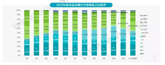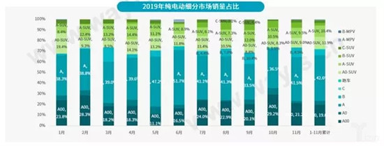 从纯电动车细分市场来看,2019年11月,纯电动市场A级轿车占比持续增长;B级轿车由于Model 3的大规模交付,份额上升了7.3%。