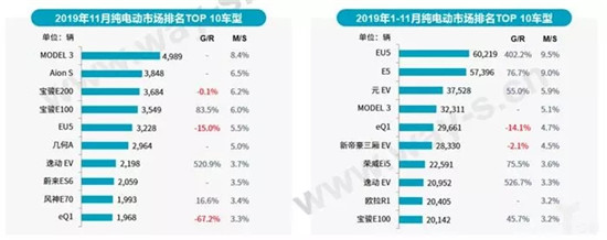 从纯电动市场车型销量排名来看,11月,Model 3交付量近5000辆,位居销量榜首;Aion S排名上升至第二;宝骏E200和E100销量均超过3500辆,位列第三、第四。累计来看,EU5、比亚迪E5和元EV销量稳居前三;Model 3排名再度回到第四,宝骏E100累计销量超过20000辆,跻身第十。