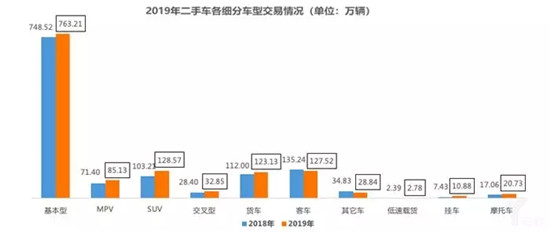 从细分车型来看,2019年1-11月,基本型乘用车共交易763.21万辆,同比增长1.96%;客车交易127.52万辆,同比下降5.71%;载货车交易量为123.13万辆,同比增长9.94%;SUV交易量达到128.57万辆,同比增长24.57%;MPV为85.13万辆,同比增长19.24%;交叉型乘用车共交易32.85万辆,同比增长15.66%。SUV、MPV、交叉型乘用车增速明显,同比增长超过10%。