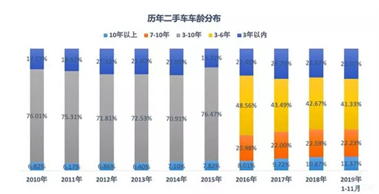 从车龄来看,2019年1-11月,使用年限在3-6年的二手车交易量最多,占比为41.33%。其次是3年内为25.07% ,7-10年占比为22.23%,10年以上占比为11.37%。