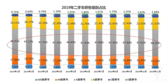 从各级别轿车来看,2019年1-11月各级别轿车的整体销量来看,A级轿车仍旧是二手车市场中最热销的车型,平均占比为47.4%;其次是B级轿车平均占比21.7%,C级和D级轿车价格相对较高,二手车销量最低。