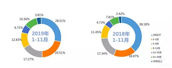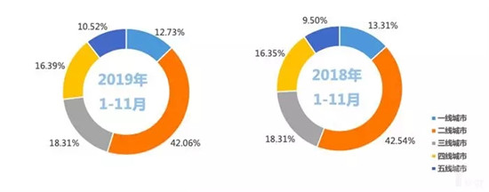 从交易区域来看,2019年1-11月二手车销量城市占比分布:一线城市占比12.73%,较去年下降0.58%;二线城市占比42.06%,较去年下降0.48%;三线城市占比18.31%,与去年持平;四线城市占比16.39%,较去年增长0.04%;五线城市占比10.52%,较去年增长1.02%。与2018的二手车市场相比,2019年四线城市和五线城市占比小幅增长,一二线城市占比有所下降。