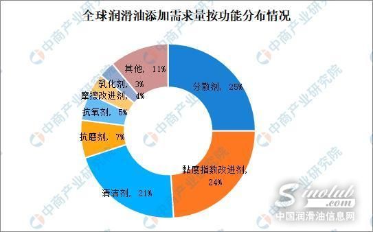 在全球,按照润滑油添加剂的功能分布来看,分散剂、黏度指数改进剂、清净剂是较常使用的3大功能剂,合计占润滑油添加剂总需求量的65-70%左右。其余添加剂中,抗磨剂占6-7%,抗氧剂及摩擦改进剂各占4-5%,乳化剂占3-4%,其他添加剂合计占需求量的11-12%。