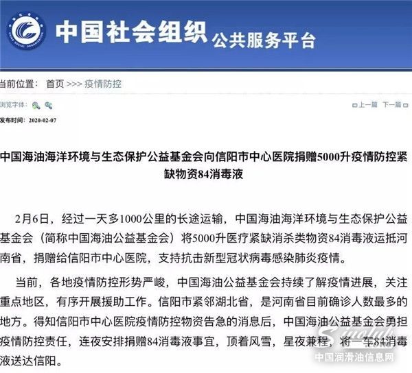 疫情就是命令,防控就是责任。得知信阳市急需防疫物资后,中国海油公益基金会紧急驰援,星夜兼程,经过1000多公里的长途运输,将5000升84消毒液运抵河南省信阳市中心医院。接收这批顶风冒雪送达的防疫物资时,信阳市政府相关负责人感动地表示,这是真正的“雪中送炭”。