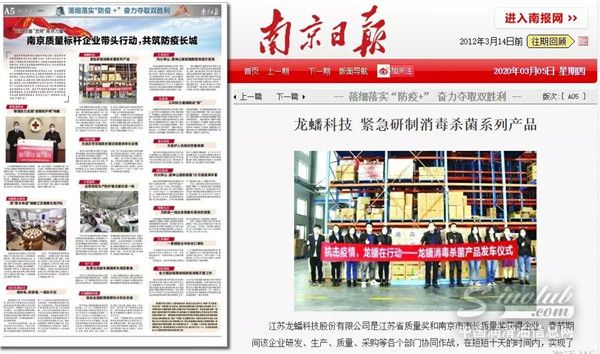 3月5日,由《南京日报》发起的“南京质量标杆企业带头行动,共筑防疫长城”的案例评选结果正式揭晓。龙蟠以新型消毒杀菌产品研制、抗疫物资捐赠等行动,获得媒体及专业人士的高度认可,被选为南京市抗疫模范企业,荣耀登上了《南京日报》主题宣传版面。
