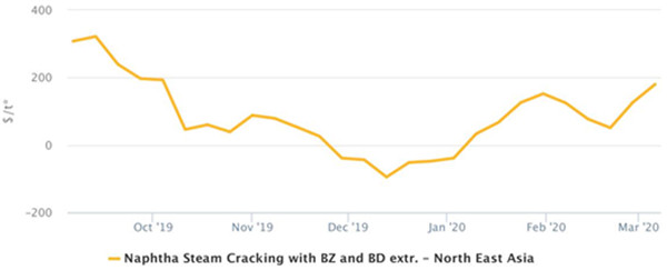 从供应端来说,原油及石脑油暴跌,使得本来薄利的乙烯裂解装置利润明显提升。ICIS数据显示,3月6日当周,东北亚石脑油乙烯裂解装置利润在180美金/吨。