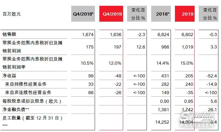 *调整后的上年销售额、常规业务范围内息税折旧及摊销前利润和利润率、员工数量数据。净收益涉及持续性经营业务和非连续性经营业务