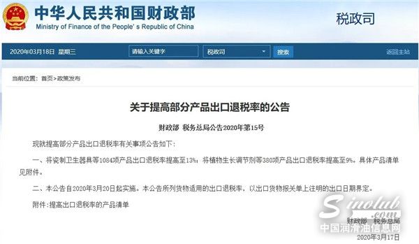 3月17日,财政部发布了“关于提高部分产品出口退税率的公告”。本公告自2020年3月20日起实施。本公告所列货物适用的出口退税率,以出口货物报关单上注明的出口日期界定。