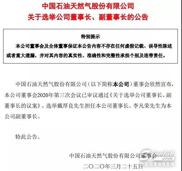3月25日,中国石油天然气股份有限公司官网发布公告宣布,选举戴厚良先生担任本公司董事长、李凡荣先生为本公司副董事长。
