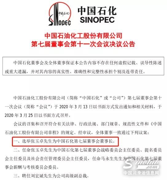 3月25日,中国石油化工股份有限公司发布公告,张玉卓当选中国石化股份公司董事长。