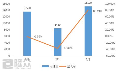 基础油用油量来看:结合隆众调研的下游42家润滑油工厂的用油量来看,1月份因各地区润滑油工厂进入春节休假期间,用油量相比上个月下降1.31%,而随着2月份公共卫生事件的发酵,复工时间延长,工厂用油量大幅度减少。3月份工厂陆续复工,用油量达到15190吨,相较于2月份环比增加80.19%。