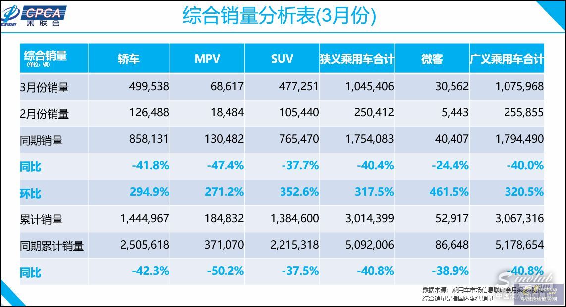 4月9日,乘联会官方公布了2020年3月乘用车产销数据,其中数据显示,2020年3月,乘用车市场(包括:轿车、SUV、MPV)零售销量达104.5万辆,同比下降40.4%,相对2月的-78.7%同比降幅大幅提升38个百分点,呈现谷底V型回升的良好态势;而1-3月的全国乘用车市场累计零售301.4万辆,零售同比累计下降40.8%。