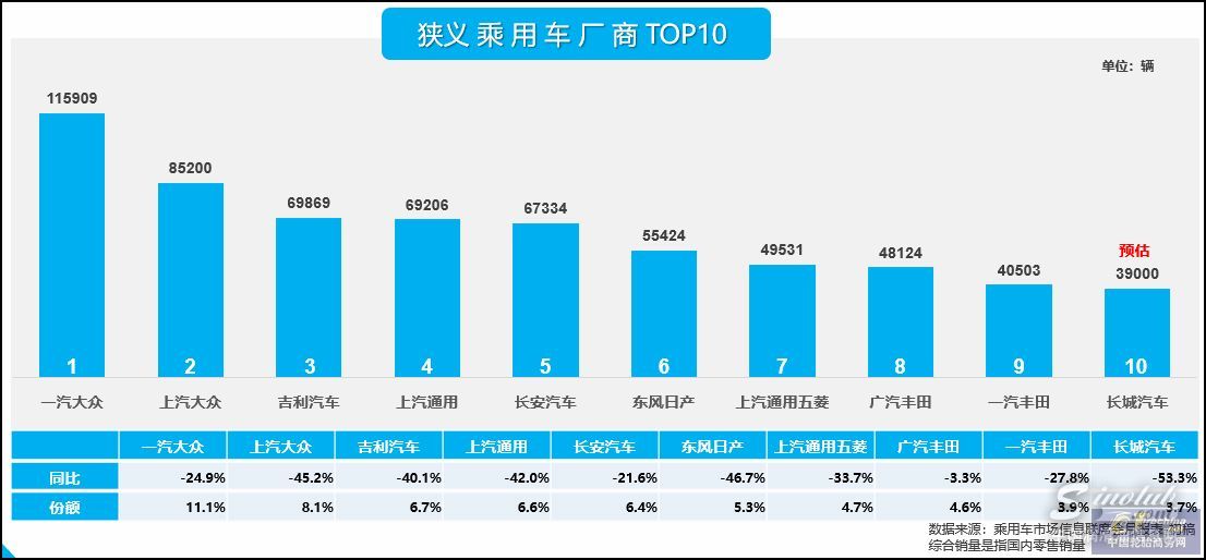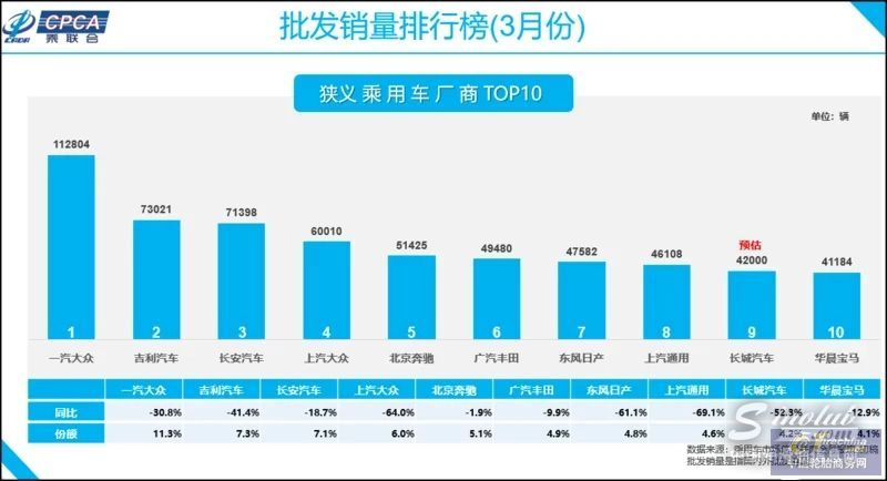 批发销量,中国品牌表现相对出色,其中吉利汽车和长安汽车跻身第二和第三名,长城汽车为第九。就前三强看,一汽-大众在批发销量方面仍为第一名,以11.3万辆同比下滑30.8%;吉利汽车为7.3万辆下降41.4%,长安汽车为7.1万辆下降18.7%。崔东树表示,从批发销量走势可看出,汽车企业正呈现分化趋势,如豪华品牌如奔驰、宝马的批发销量走强,大型车企的批发销量相比中小车企来说表现较好等。