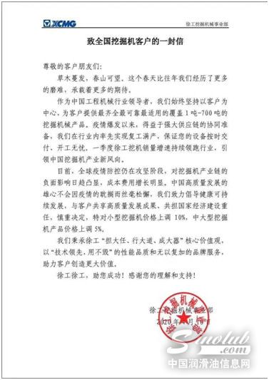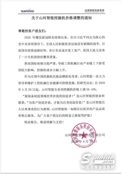 (3)4月13日,雷沃工程机械发布《敬告客户书》,表示将对小型挖掘机价格上调10%,对中大型挖掘机价格上调5%。