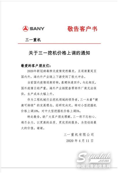 (2)4月11日,三一重机发布敬告客户书——《关于三一挖机价格上调的通知》称,其公司的挖掘机价格上调,小挖上调10%,中大挖上调5%。