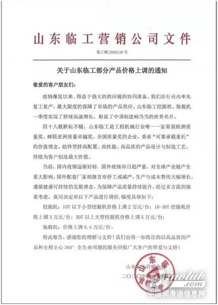 (4)4月14日,山东临工营销公司发布消息称,山东临工10吨以下小挖上调2万元,10-30吨挖机上调3万,30吨以上挖机上调5万元。