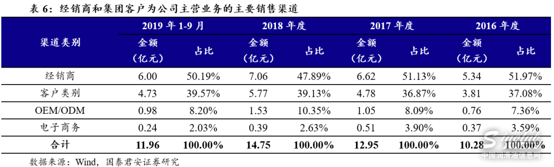 经销商和集团客户为公司主营业务的主要销售渠道。近年来公司主要的销售渠道包括经销商、集团客户、OEM/ODM和电子商务,其中经销商和集团客户渠道2019年1~9月销售收入占主营业务收入的90%左右。公司2016年度、 2017年度各渠道的销售占比基本保持稳定,2018年度经销商、电子商务渠道的销售占比略有下降,集团客户、OEM/ODM渠道的销售占比略有上升,主要在于2018年7月,公司收购瑞利丰70% 的股权,将瑞利丰及其下属控股子公司迪克化学纳入合并报表范围,迪克化学的集团客户渠道销售收入占比较高。