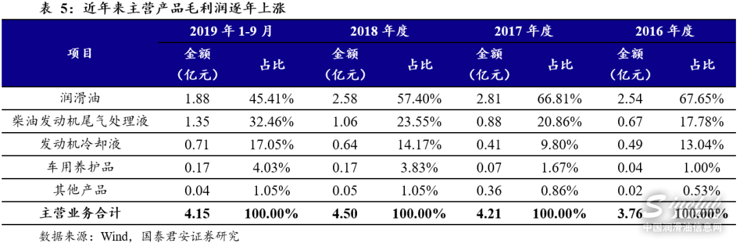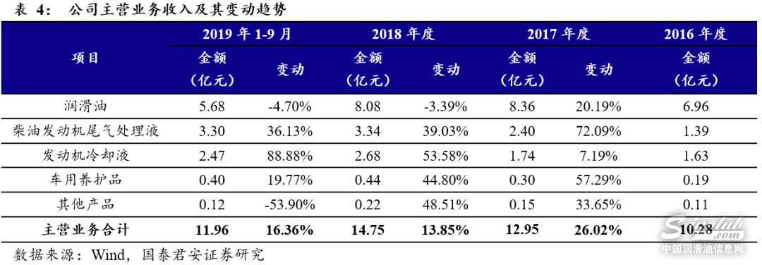 公司主营业务突出。公司2016年~2018年及2019年1~9月,主营业务收入分别为10.28亿元、12.95亿元、14.75亿元和11.96亿元,分别占主营业务收入的99.19%、99.84%、98.46%和98.32%。主营业务按产品可分为润滑油、柴油发动机尾气处理液、发动机冷却液、车用养护品等车用环保精细化学品等。润滑油为公司最主要的产品,2016年~2018年及2019年1~9月其营业收入分别为6.96亿元、8.36亿元、8.08亿元和5.68亿元。除润滑油外,柴油发动机尾气处理液和发动机冷却液为公司第二和第三营收产品来源,且近年来收入不断增长。