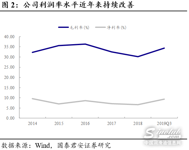 公司为国内知名的独立润滑油企业。自成立以来,公司一直从事车用环保精细化学品的生产和销售,主要产品包括车用汽油机油、柴油机油、3ECARE汽车养护品、车辆齿轮油、液压油和工业润滑油等。目前,公司形成了集润滑油、发动机冷却液、柴油发动机尾气处理液、车用养护品等于一体的车用环保精细化学品的产品体系。公司先后荣获南京市长质量奖、江苏省质量奖、江苏省著名商标、中国驰名商标等多项称号。2019年1~9月公司实现营业收入12.17亿元,同比上升16.14%;归母净利润0.95元,同比上升69.94%。公司毛利率和净利率均有所上升,2019年三季度公司的毛利率和净利率分别为34.34%和9.32%。