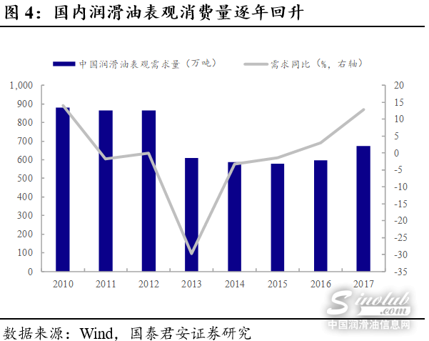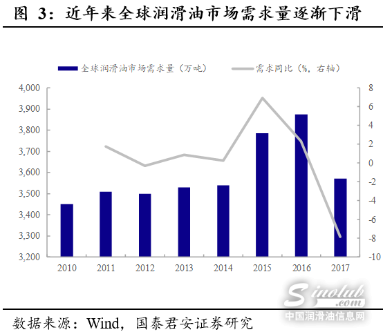 近年来全球润滑油市场需求量逐渐下滑,而国内润滑油表观消费量逐年回升。公司主要产品润滑油市场的发展受到国家宏观经济形势以及交通运输、机械设备等行业的发展影响。近年来,全球润滑油市场需求有下滑趋势,2017年,全球润滑油需求量为3,570万吨,较2016年下降303万吨,降幅达7.82%。与全球市场相反,国内近年来润滑油表观消费量呈现出逐年回升,2017年润滑油表观消费量为673.90万吨,较2016年上涨12.90%。