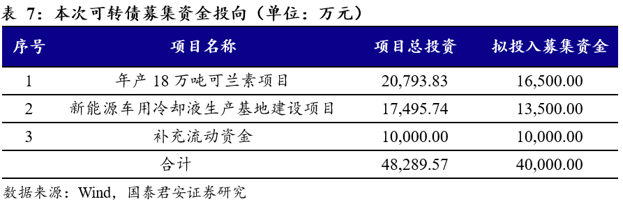 公司本次发行可转债拟募集资金总额不超过4.00亿元,将全部用于年产18万吨可兰素项目、新能源车用冷却液生产基地建设项目和补充流动资金。