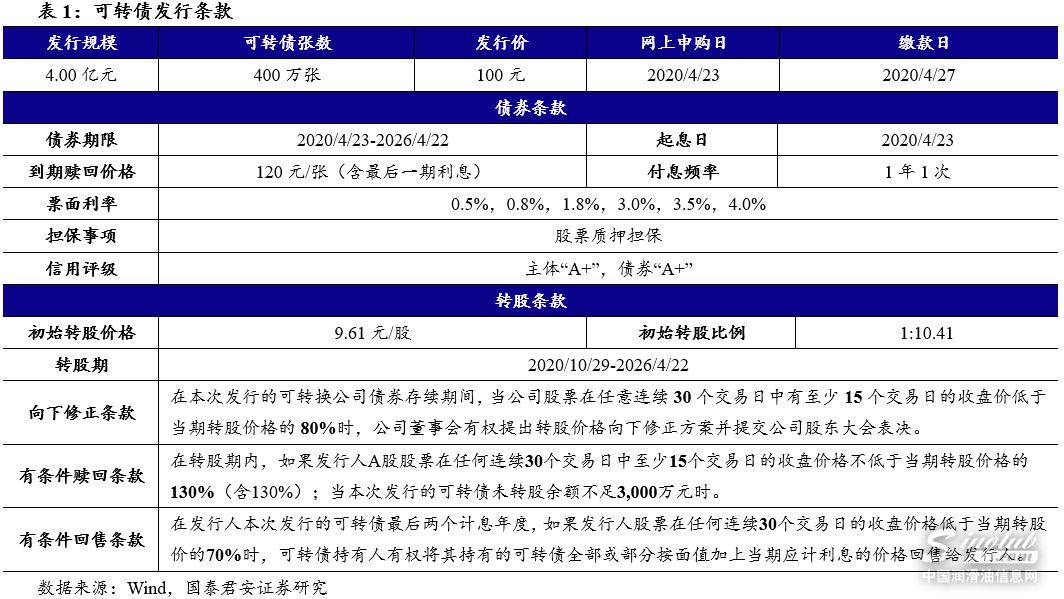 发行信息:本次转债发行规模为4.00亿元,网上申购及原股东配售日为2020年4月23日,网上申购代码为“754906”,缴款日为4月27日。公司原有股东按每股配售1.321元面值可转债的比例优先配售,配售代码为“753906”。网上发行申购上限为100万元,主承销商中信证券(23.180, -0.01, -0.04%)最大包销比例为30%,最大包销额为1.20亿元。