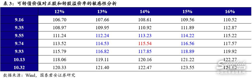 预计龙蟠转债上市首日定价区间为115~116元。按照2020年4月21日收盘价计算,龙蟠转债对应平价为101.35元。目前同等平价附近的百达转债转股溢价率为11.15%。考虑到公司当前股价对应的转债平价高于面值,公司评级较低,我们预计龙蟠转债上市首日的转股溢价率区间为【13%,15%】,当前价格对应相对估值为115~117元。绝对估值下,理论价格为115~116元。综合考虑,我们预计龙蟠转债上市首日的定价区间为115~116元。