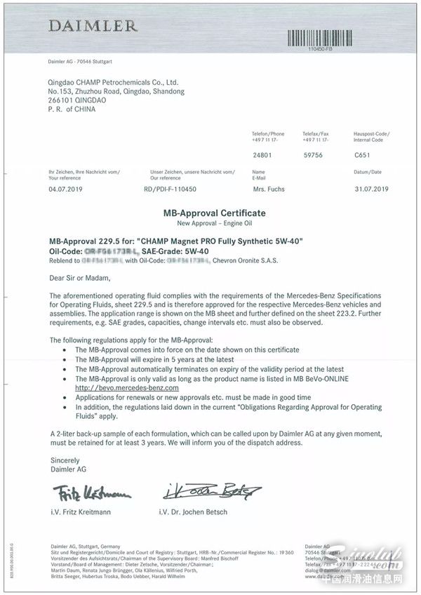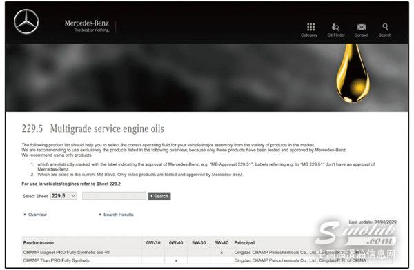 其中奔驰MB229.5是目前全球最严格的发动机油标准之一,以“长效”著称,要求所测机油在奔驰指定的发动机台架试验中,换油周期为25000至50000公里,机油的节油性能也较之普通机油节油1.7%。