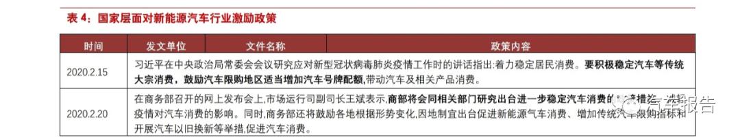 在当前形势下补贴政策发力,一方面能有效对冲疫情不利因素,另一方面表明国家支持新能源汽车长期发展态度不变,2021-2022年我国新能源汽车销量有望超预期。新能源汽车补贴政策和减免购置税政策原则上都将于2020年到期,本次调整明确将新能源汽车购置补贴和免征购置税两项优惠政策再次延长2年(预计至2022年中),一方面有助于在当前形势下促进新能源汽车消费,提振新能源汽车销量,另一方面也有利于新能源整车厂更从容的进行新车型规划与战略调整,避免19年补贴大幅退坡而整车厂匆忙应对的局面再次出现。在当前汽车消费疲软、油价大跌等情形下,国家的政策导向对新能源汽车长远发展至关重要,而两项优惠政策再次说明国家对新能源汽车强有力的支持态度。我们认为当前国家层面和地方层面各项政府将形成合力,有效对冲新冠疫情对国内新能源汽车消费的不利影响,短而有力的奖补措施将大幅刺激终端消费预期,同时长政策有望将新能源汽车景气度向21-22年延续,从而发挥更好的调控作用。