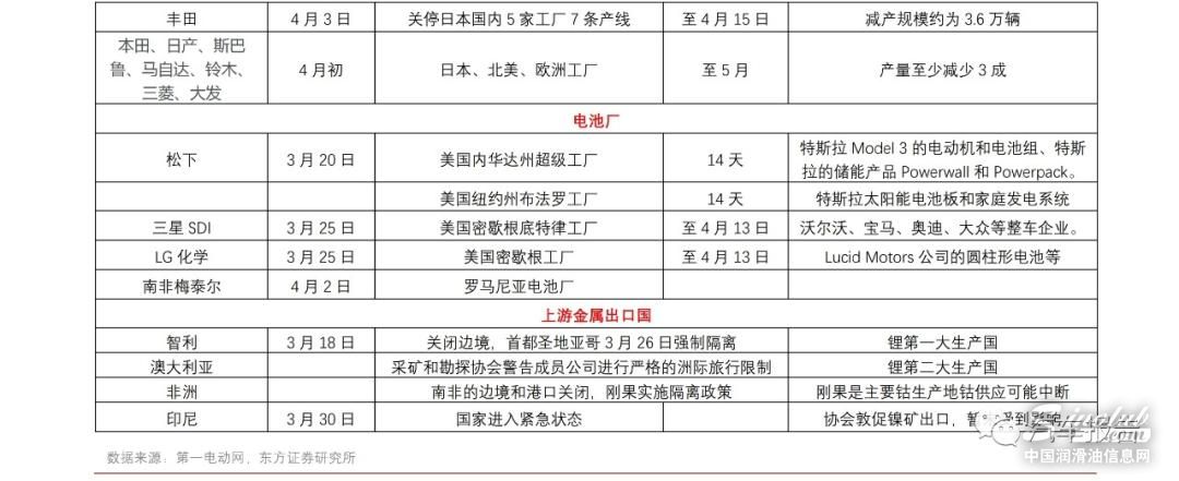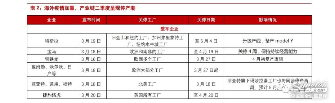 车企停产,供应受挫,Q2海外产销压力陡增。新冠疫情对海外市场的打击力度非常大,汽车企业纷纷停产,截止3月底已经停产的车企工厂数量超过70座。同时,产业链上游电池厂和原料厂也因为疫情原因而部分关停,整个产业链的变动使得二季度全球新能源汽车销量面临巨大压力,我们预计自4月份起,海外汽车销量将大幅下滑,新能源汽车也难以避免,并且将持续到三季度。从当前关注的复产情况来看,仅部分车厂正在恢复并计划恢复,如大众,特斯拉等,而更多车企则延期恢复生产至4月底甚至5月初。