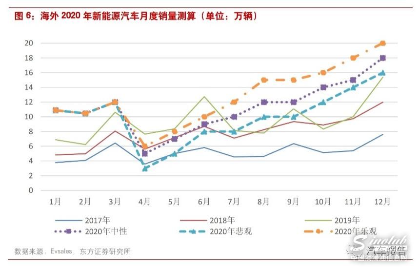 根据疫情进展,我们也对海外新能源汽车销量做了推演,合理预期下全年有望实现135万辆,较原预测值下降10%。海外普遍认为5月份起工厂可以陆续复工,以产线恢复期一个月计算,我们对海外整个二季度的电动车产销规模都抱以谨慎态度,而三季度和四季度的疫情预期明显要乐观很多,海外将出现明显的恢复性增长,叠加一季度良好的销量基础,我们认为疫情结束后海外市场弹性将非常大。合理测算,我们预计海外今年销量预期在135万辆左右,也就是说如果没有疫情影响,那么今年海外大概率超出原150万辆销量预期,其中主要的弹性增量仍然是欧洲。在碳排放压力下和共享汽车产业推动下,2020年欧洲电动汽车的销量有望达到92万辆。