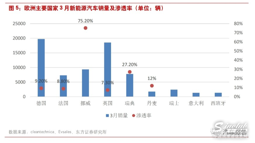欧洲多个国家一季度数据亮眼一方面由于在欧盟碳排标准严格执行的压力下各国补贴及新能源相关政策支持力度到位,另一方面也与去年同期基数较低有关。疫情对燃油汽车销量下滑的影响更大,叠加新能源汽车逆势增长,呈现出新能源汽车渗透率加速提升的现象。我们认为欧洲将是未来弹性较大的市场,各项政策的延续性可以保障疫情之后产业快速恢复。