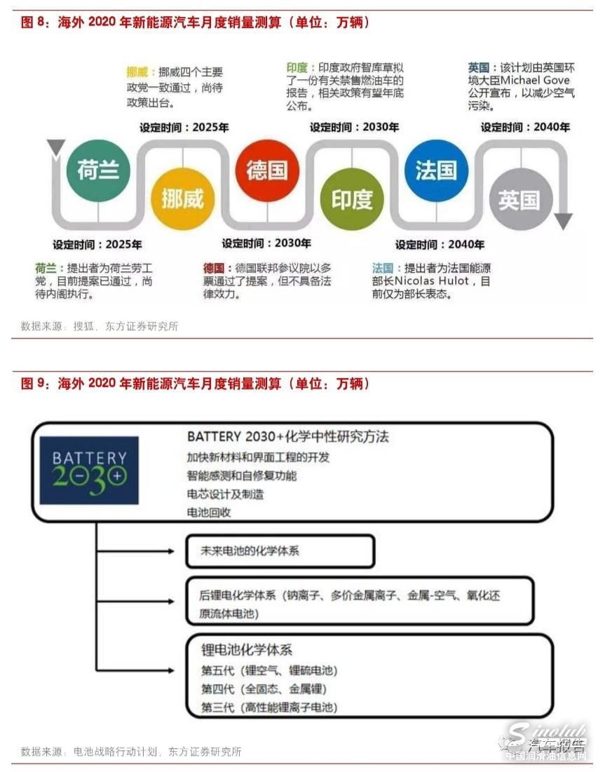 目前,欧洲多国如法国、英国、挪威、西班牙、荷兰等,都提出了禁售传统燃油车的时间表,部分城市开始划定燃油车的禁行区域。以西班牙首都马德里为例。自2018年11月30日起,马德里中心城区限行计划正式实施,除中心区居民汽车、零排放汽车(CERO)、生态环保车辆(ECO)等车型,所有燃油车禁止在该区域行驶。政府的“禁油”力度将极大的推动欧洲各国电动汽车的发展。欧洲委员会也在2018年制定了未来十年电池研发路线图:“BATTERY2030+”计划,计划在2030年打造超高性能电池,为欧洲工业创造颠覆性技术和整个价值链的竞争优势。