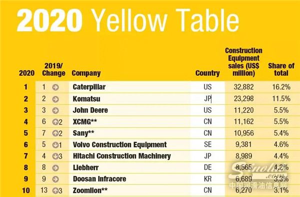 徐工凭借111亿美金的营销收入由去年的第六位上升至第四位,并且距第三名的约翰迪尔仅有微弱差距;三一重工排名由去年的第七位提升至第五位;中联重科排名从去年的第十三位成功挤进前十。