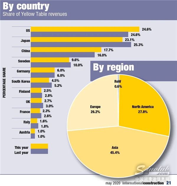 5月18日,英国KHL集团发布了一年一度的全球工程机械制造商50强排行榜。榜单显示,今年上榜的50家公司总体的销售总额为2,027亿美金,比上一年增长了10%,这也是Yellow Table有史以来首次总销售额突破2,000亿美金。